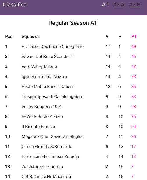 来源:24直播网02-16 21:1624直播网讯02月16日意甲第18轮已经正式落下帷幕,意大利女排联赛一共有26轮,如今仅剩8轮,各队的竞争还是很激烈的,有力争常规赛冠军,也有卡位需求的队伍,还有的球队力争保级。目前科内利亚诺以17胜1负排名第一,朱婷和姚迪所在的斯坎迪奇位居第二,缪伊雯新东家皮内罗洛处于降级区,排名倒数第二。按照意甲的规则,1-8名参加季后赛,倒数两名球队降级到意乙联赛。