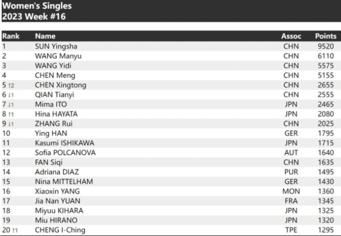 女单的统治力相当强,包揽了世界前六,9520分的孙颖莎世界大赛21连胜,连续夺得4项大赛的单打冠军,在新乡又拿下1000个冠军积分。 王曼昱 、王艺迪和陈梦排名第2-4名,其中王艺迪在新乡获得女单亚军。陈幸同在新乡冠军赛打进四强,她的世界排名从第7升至第5,反超伊藤美诚和钱天一。钱天一位居世界第六,他的成长有目共睹。伊藤美诚以2465分排名下滑到第7名