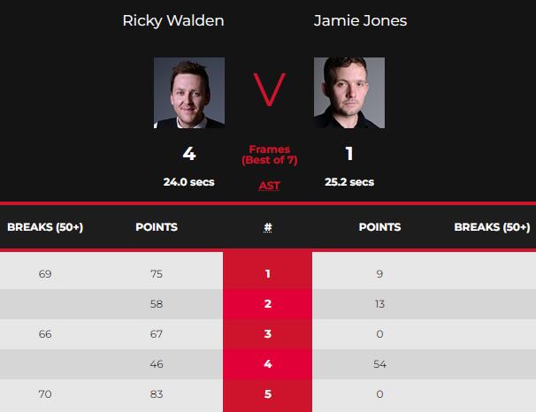 第三局,琼斯长台不进,沃顿打进红球防守;防守比拼,有红球来到球台上方,琼斯只能拼进攻不进,沃顿上手单杆66分拿下第三局。沃顿3-0赛点。第四局,琼斯16-46落后,最终是54-46逆转追回一局。第五局,沃顿中袋不进,琼斯贴库红球也不进,沃顿上手单杆70分超3分,沃顿再次上手拿下了比赛。