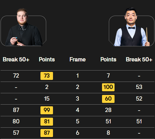 在经过一番激烈的攻防转换后,西斯考特最终还是凭借出色的发挥拿下了这一局,从而以4-2的总比分战胜田鹏飞,成功晋级。