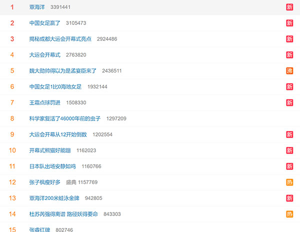 来源:24直播网07-29 12:3124直播网讯07月29日堪称是体坛之夜,成都大运会拉开大幕,开幕式美轮美奂。中国女足在生死战以1-0击败海地,挽救晋级希望。游泳项目也传来巨大利好消息,覃海洋在男子200米蛙泳项目以打破世界纪录的成绩夺冠,加冕新蛙王。热搜榜上,大运会、中国女足和覃海洋处霸屏的状态,引发全民关注。