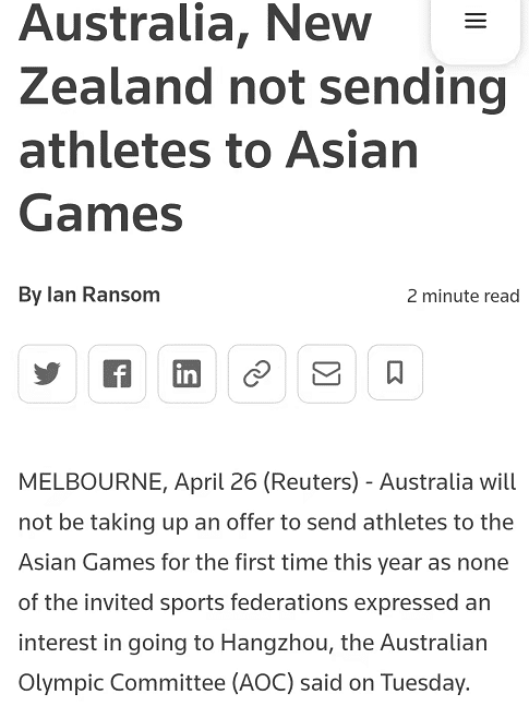澳大利亚奥委会官方宣布了这一消息,表示将不会接受首次派运动员参加亚运会的邀请,因为没有一个受邀的体育协会表示有兴趣参加杭州亚运会。而新西兰奥委会发言人也证实,新西兰不会参加亚运会。