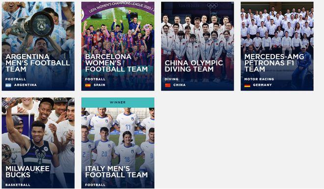 中国唯一获得提名的奖项是最佳团队奖,中国跳水队以冬奥会斩获七金的骄人战绩入榜,只不过最终摘得该奖项的是拿到了2021年欧洲杯冠军的意大利男足,比较尴尬的是意大利男足今年年初刚刚无缘世界杯,拿到这个奖项真的是让人哭笑不得,此外,NBA巨星字母哥领衔的雄鹿队,阿根廷男足、巴塞罗那女足、F1梅赛德斯车队也都获得了提名。