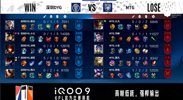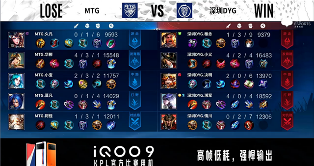 2分11秒,MTG中路击杀西施拿下一血,随后深圳DYG控下暴君。3分秒,深圳DYG破掉MTG下一塔。3分40秒,主宰团,露娜控下先知主宰,深圳DYG打出0换2。5分37秒,深圳DYG破掉MTG上一塔,随后连续破掉MTG上二塔。6分45秒,深圳DYG控下暴君,随后破掉MTG中一塔。8分钟,野区团,MTG击杀西施。8分38秒,MTG控下暴君,随后接连控下主宰。9分18秒,深圳DYG破掉MTG下二塔。11分26秒,MTG露娜抢下暗影主宰。13分02秒,MTG控下暗影暴君。13分58秒,中路团,深圳DYG击杀夏侯惇。16分02秒,MTG控下暗影主宰。17分09秒,MTG控下暗影暴君,随后破掉深圳DYG下二塔。17分30秒,野区团,深圳DYG击杀太乙真人,MTG破掉深圳DYG中一塔。19分20秒,中路团,深圳DYG打出0换2,随后破掉MTG上路高地塔一鼓作气摧毁水晶拿下本场比赛的胜利。