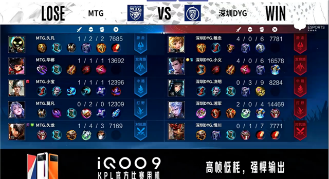 1分23秒,深圳DYG弈星下路击杀蒙犽拿下一血。2分09秒,深圳DYG控下暴君。2分35秒,深圳DYG中路击杀吕布。3分17秒,深圳DYG中路击杀张飞,随后控下先知主宰。4分15秒,野区团,深圳DYG击杀吕布。6分27秒,深圳DYG破掉MTG上一塔。6分54秒,深圳DYG先后破掉MTG下一塔和中一塔,随后控下暴君。7分24秒,深圳DYG破掉MTG下二塔。7分46秒,中路团,深圳DYG击杀吕布,随后MTG破掉深圳DYG中一塔。8分54秒,深圳DYG控下主宰。10分08秒,深圳DYG中路击杀吕布,随后爆发团战双方打出1换1。11分03秒,深圳YG控下暗影暴君。11分43秒,深圳DYG下路击杀不知火舞。12分06秒,深圳DYG破掉MTG中二塔。12分30秒,野区团,MTG打出2换3,随后控下暗影主宰。14分53秒,MTG控下暗影暴君。18分钟,中路团,深圳DYG打出0换2,随后破掉MTG下路高地塔和中路高地塔。18分45秒,高地团,深圳DYG团灭MTG,随后破掉水晶连下三城。