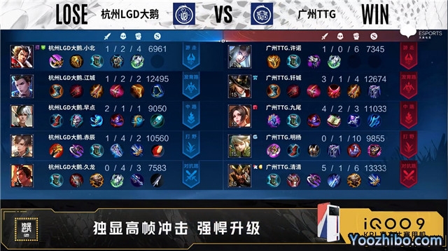 双方常规开局。56秒野区团战杭州LGD大鹅打出1换3,裴擒虎拿到三连决胜。3分40秒杭州LGD大鹅拿下暴君。4分16秒杭州LGD大鹅摧毁敌方发育路外塔。5分18秒杭州LGD大鹅摧毁敌方对抗路二塔。7分17秒杭州LGD大鹅摧毁敌方中路外塔。8分04秒杭州LGD大鹅拿下暴君。8分50秒广州TTG击杀蒙恬并摧毁敌方中路外塔。11分41秒杭州LGD大鹅野区击杀沈梦溪。12分23秒杭州LGD大鹅拿下暗影暴君。13分34秒广州TTG橘右京发育路单杀鲁班七号。14分10秒广州TTG拿下暗影主宰。15分16秒广州TTG摧毁敌方对抗路高地塔。16分09秒广州TTG拿下暗影暴君。19分21秒高地团战杭州LGD大鹅击杀猪八戒,广州TTG摧毁敌方发育路、中路高地塔。20分42秒野区团战杭州LGD大鹅打出0换2并拿下风暴龙王。22分14秒高地前团战杭州LGD大鹅击杀牛魔。22分33秒高地团战广州TTG打出0换3,狄仁杰拿到三连决胜。24分02秒广州TTG野区击杀蒙恬。24分19秒广州TTG拿下风暴龙王。25分24秒广州TTG强点敌方水晶拿下比赛。