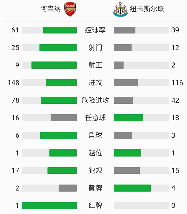 阿森纳2-0击败纽卡斯尔 奥巴梅扬建功史密斯-罗破门
