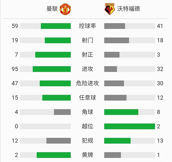 第5分钟,曼联取得领先,特莱斯开出角球,麦克托米奈头球冲顶砸在立柱上反弹入网,曼联1-0沃特福德。